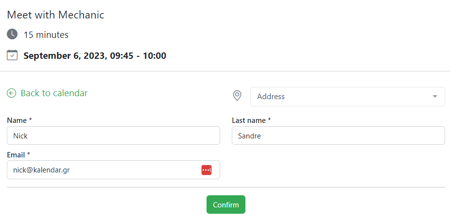 After the customer chooses date and time, he will enter his details and reserve his appointment. You can enter additional fields to fill in depending on the type of the event.